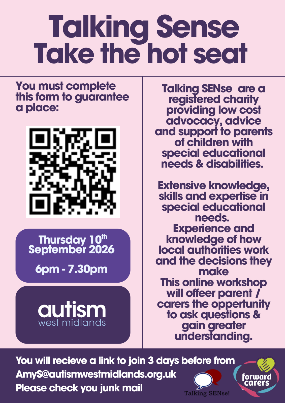 Please see the leaflet below for information on a Talking Sense - Take the Hot Seat online workshop on Thursday 10th September: