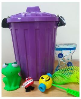 A bucket is filled with visually engaging toys, aiming to teach children how to focus their attention. The adult leader presents a toy to the group and uses simple vocabulary to make comments on the objects.